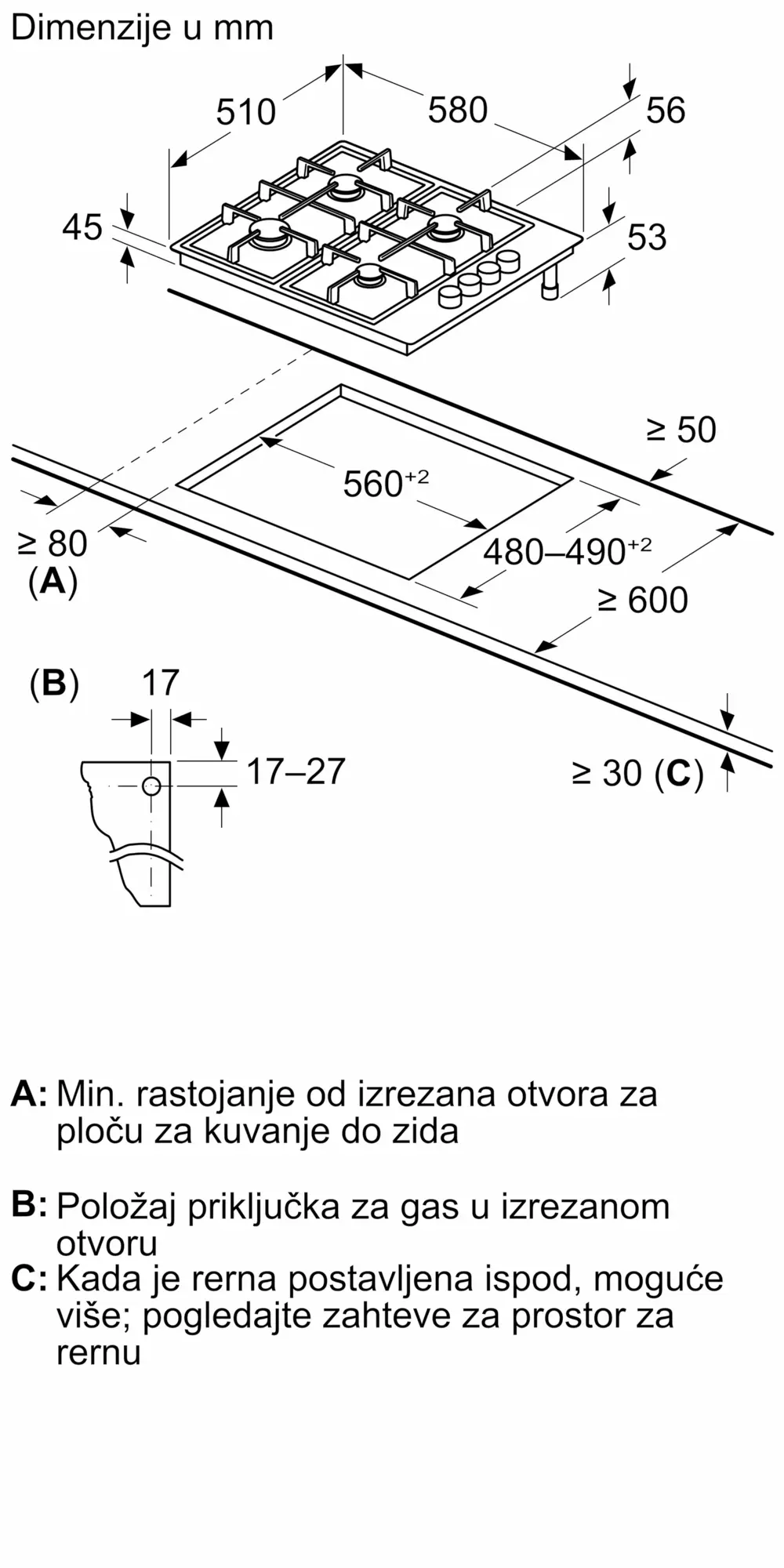 BOSCH PBY6C5B62O Built In Gas+Elec Hob Serie2 60cm S.Steel