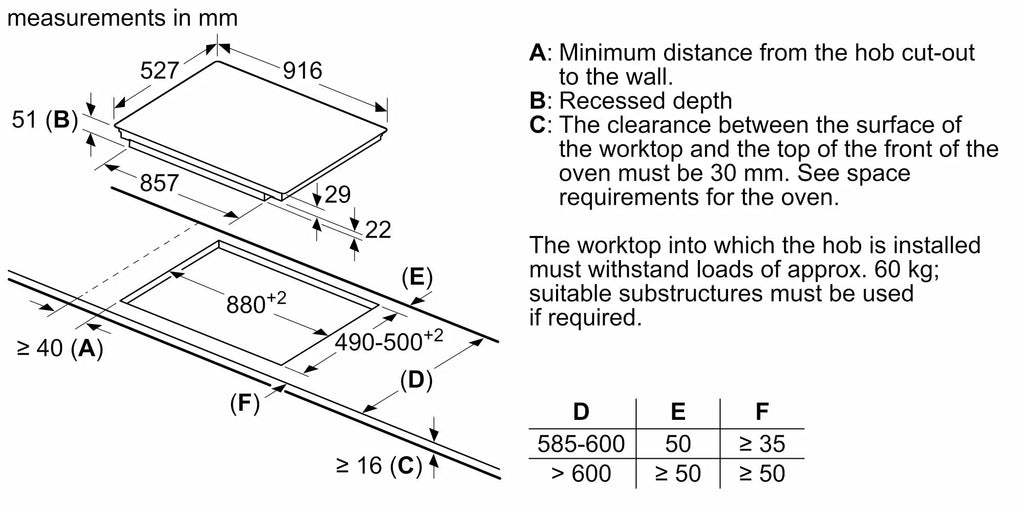 | Niche / cut-out (H×W×D) | 51 × 880 × 490–500 mm (min. worktop 16 mm) |