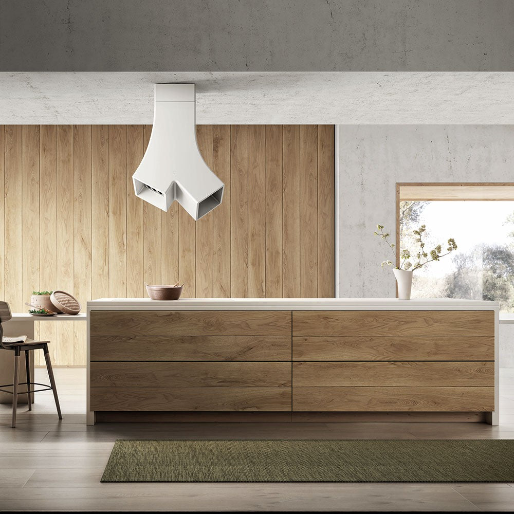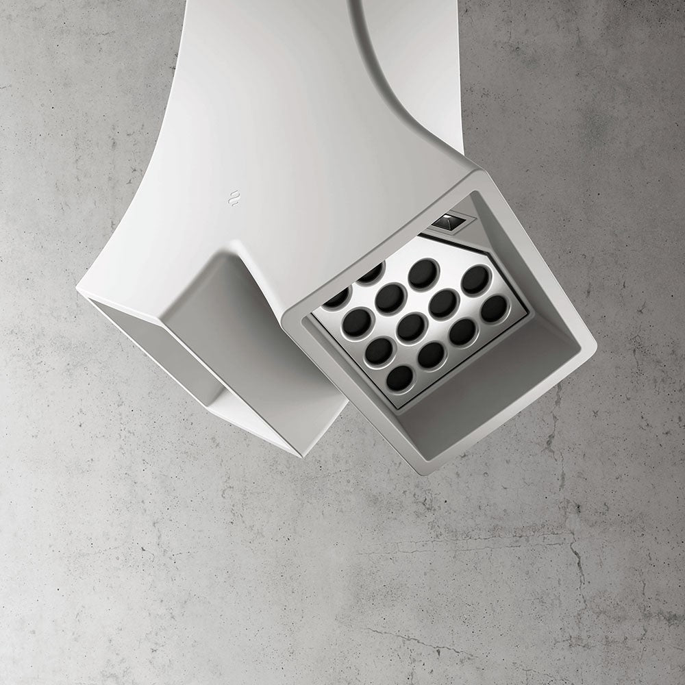 Statement island hood in white Cristalplant finish with remote control, LED lighting and boost extraction up to 900 m3/h.